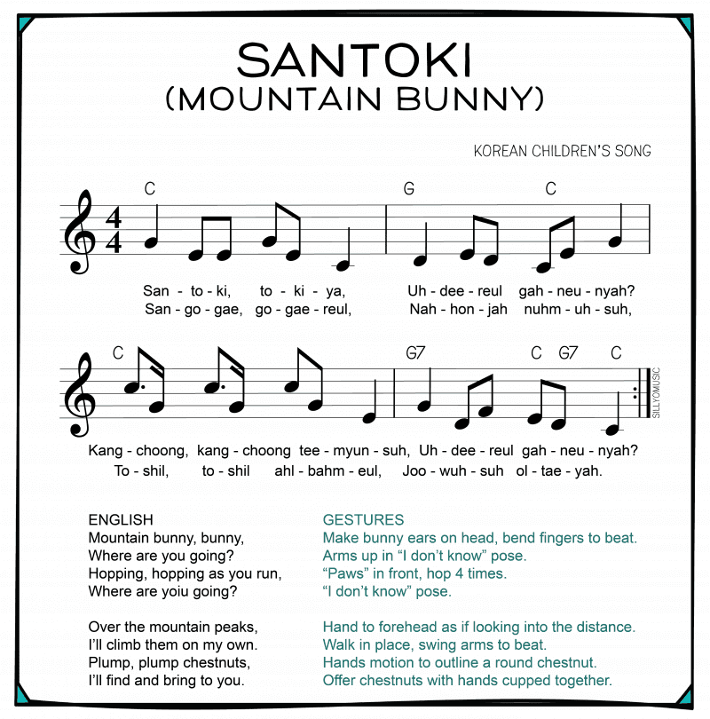 Hi, Jane here from SillyOMusic! Today I want to share a song that I (and pretty much every other Korean person) sang as a child, Santoki. When I was in Preschool, I remember singing it for my parents’ friends and then hiding under the dining room table. My stage fright has improved slightly since then, and this song will always have a special place in my heart!